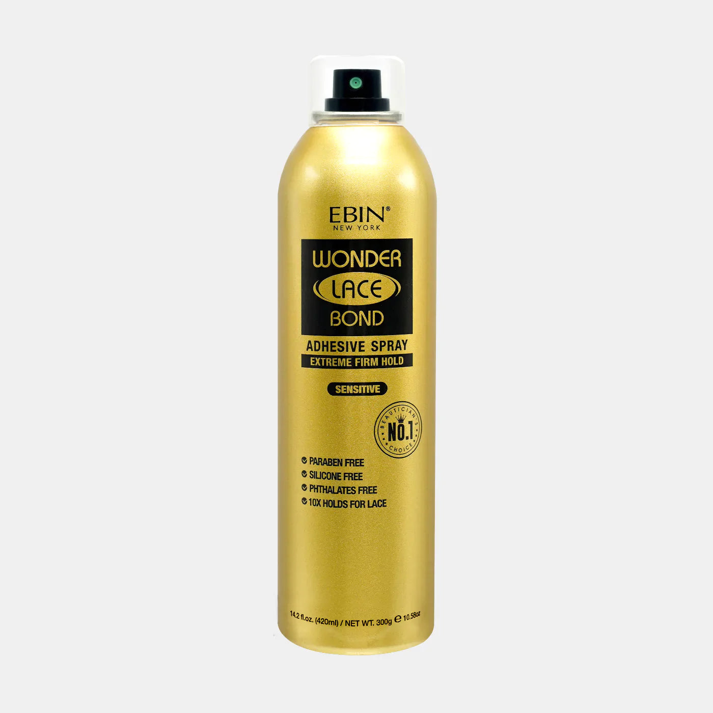 EBIN's Wonder Lace bond Adhesive Spray Sensitive is formulated for anyone with sensitive skin. Our carefully created formula i intended to give a secure hold without irritation, Gentle enough for everyday wear. Weight stated on the spray bottle is the total weight which includes the gas, product and the bottle. Net WT. is 65 % of the total weight which is the weight of the product inside the bottle, because the maximum amount of VOC (Volatile Organic compound) to safely fill up the bottle is 65% of the total weight. To clarify, the cans are not filled to maximum capacity for your safety and the safety of others.